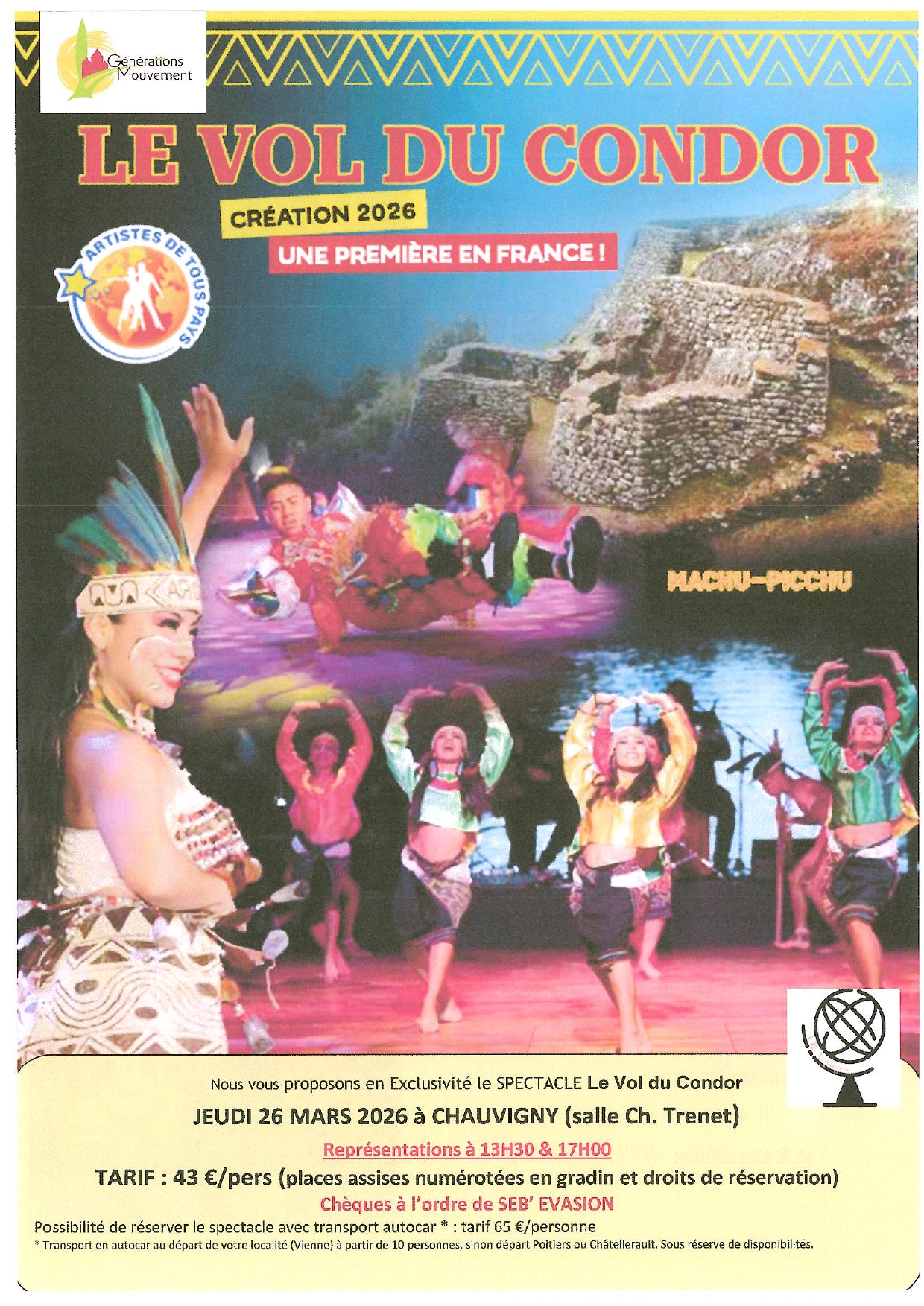 Notre calendrier 2026 continue de s’étoffer ! Nous vous proposons en Exclusivité le SPECTACLE Le Vol du Condor : JEUDI 26 MARS 2026 à CHAUVIGNY (salle Ch. Trenet) Représentations à 13H30 & 17H00 TARIF : 43 €/pers (places assises numérotées en gradin et droits de réservation) Chèques à l’ordre de SEB’ EVASION Possibilité de réserver le spectacle avec transport autocar * : tarif 65 €/personne * Transport en autocar au départ de votre localité (Vienne) à partir de 10 personnes, sinon départ Poitiers ou Châtellerault. Sous réserve de disponibilités. Nous disposons d’un nombre de places limité, il faut faire vite !