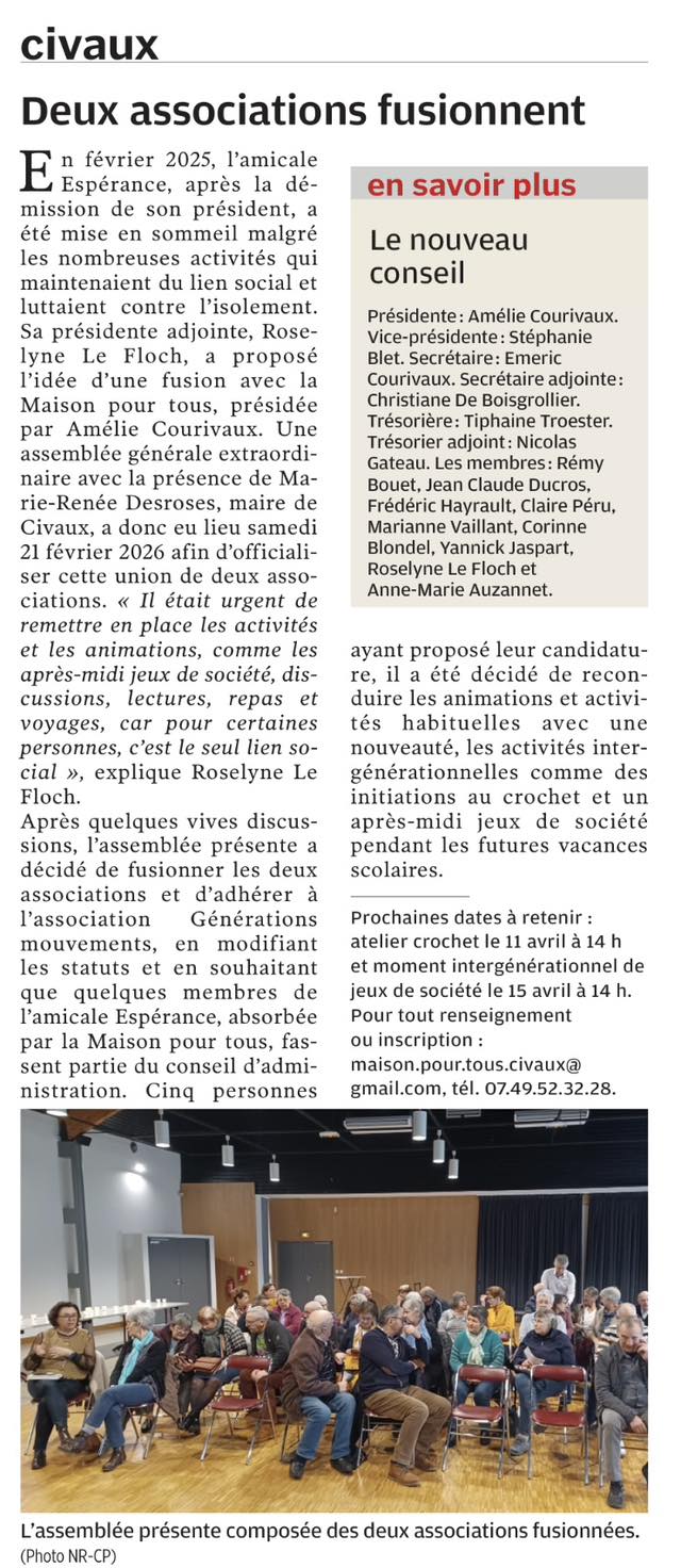 Bienvenue à Générations Mouvement à tous les adhérents de Civaux !