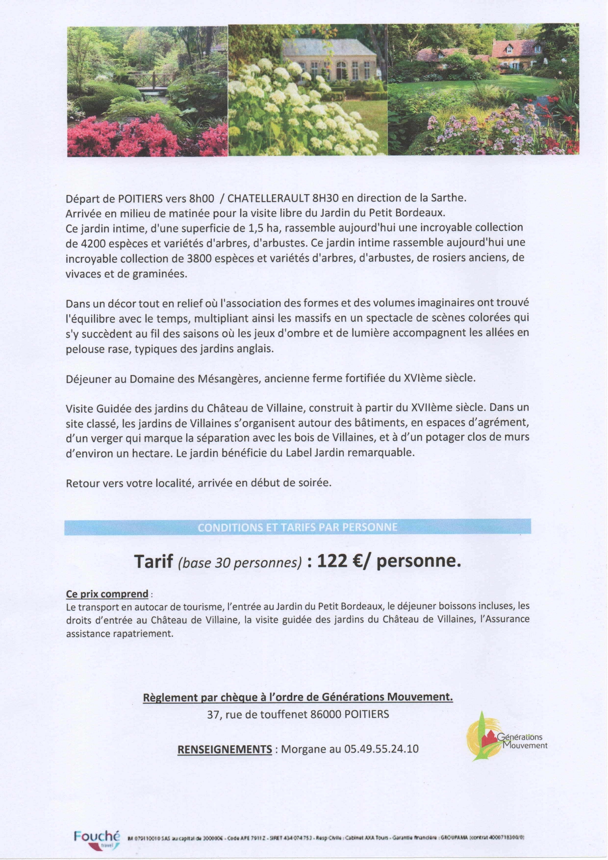 Avec possibilité d’échelonner le paiement, renseignements à : Fédération Générations Mouvement de la vienne.