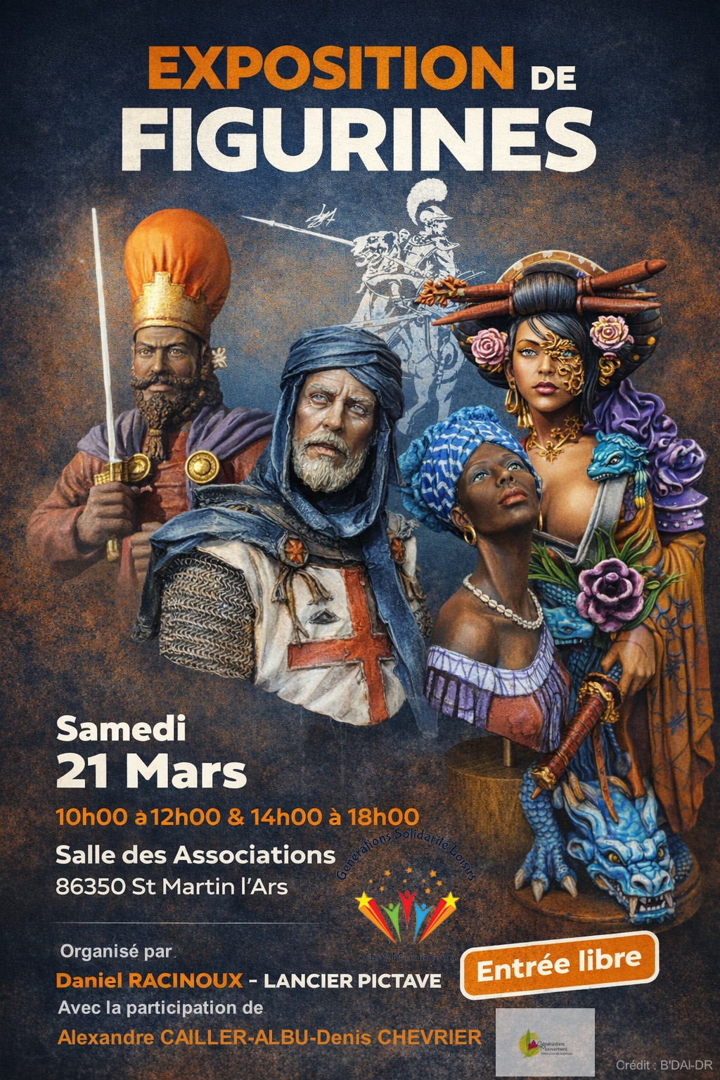 Exposition exceptionnelle du Lancier Pictave à voir à Saint Martin l’ars ! avec la présence des artistes qui ont conçu les figurines et qui seront à votre écoute pour vos questions et expliquer leur passion. Venez apprécier la minutie de leur travail et vous émerveiller . ouvert à tous ! entrée libre . samedi 21 mars . Salle des Associations rue du plan d’eau. Avec le concours de Générations Solidarité Loisirs et GM86.