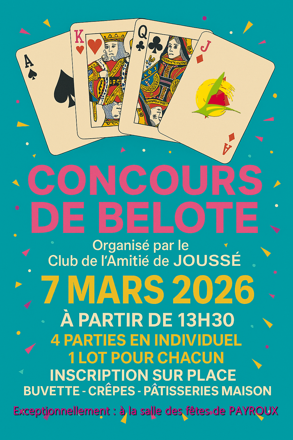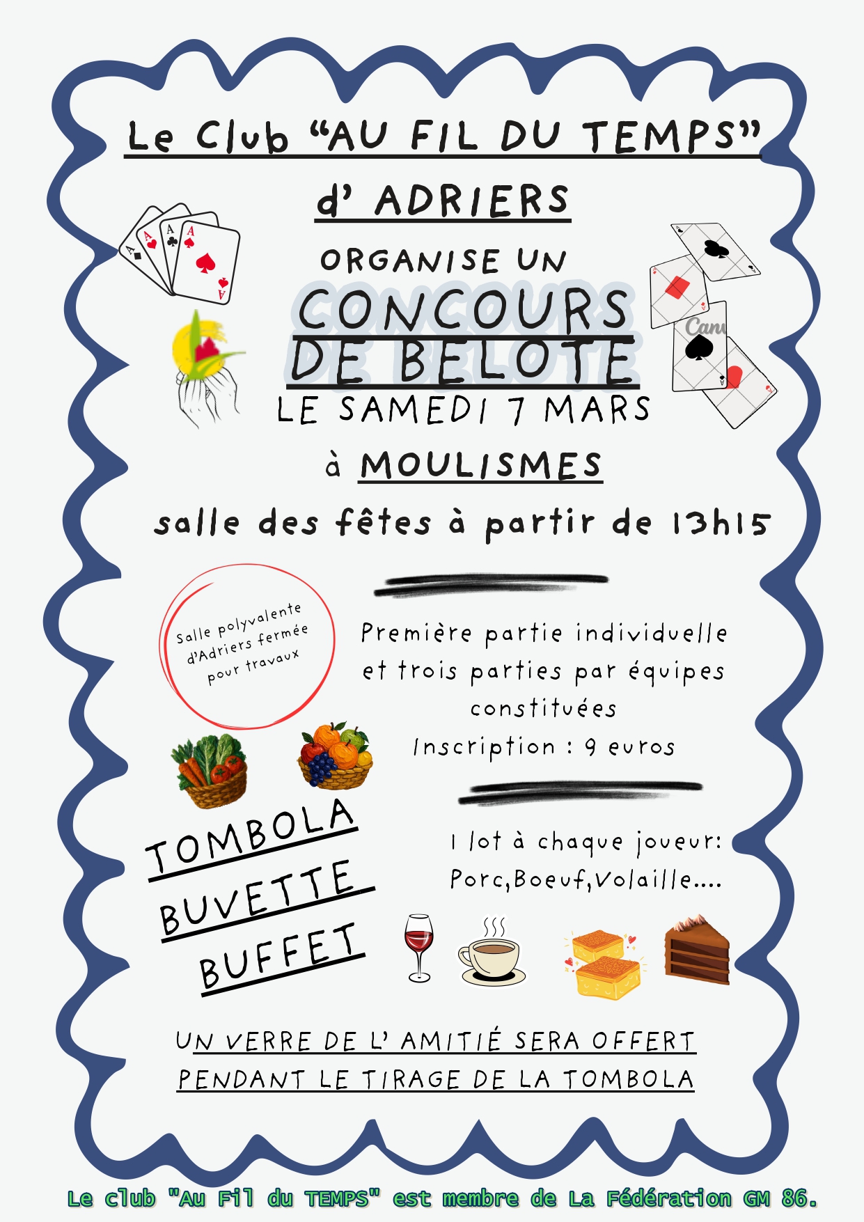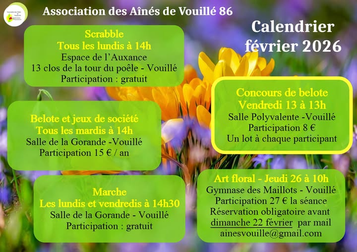 CALENDRIER DES MANIFESTATIONS 2026 28 mars Repas de Printemps 01 mai Belote 09 mai Sortie au Marais Poitevin 20 juin Loto 29 août Déjeuner-spectacle du 50e anniversaire 12 septembre Vide Grenier 04 octobre Randonnée au profit d’Octobre Rose 17 octobre Repas d’Automne 12 décembre Loto « Spécial Fêtes » « Dates susceptibles de modifications, merci de vérifier avant l’événement. » |
