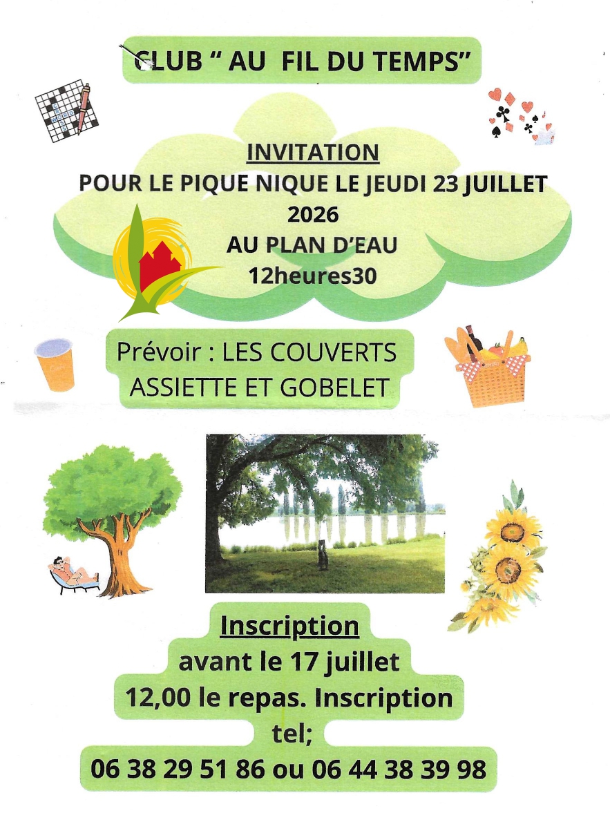 Le club d' Adriers "AU FIL DU TEMPS" organise un pique-nique le 23 juillet 2026 au plan d'eau .