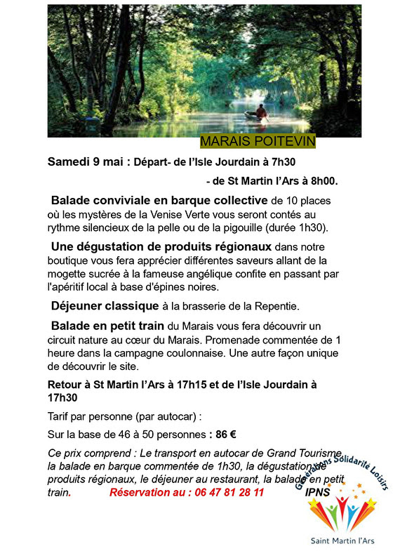 L’association Générations Solidarité Loisirs vous propose une journée conviviale à la découverte de la célèbre Venise Verte, dans le Marais Poitevin.
