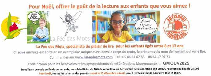 En partenariat avec Générations Mouvement de la Vienne, une remise vous sera accordée pour l’achat de livres personnalisés pour vos enfants ou petits enfants.